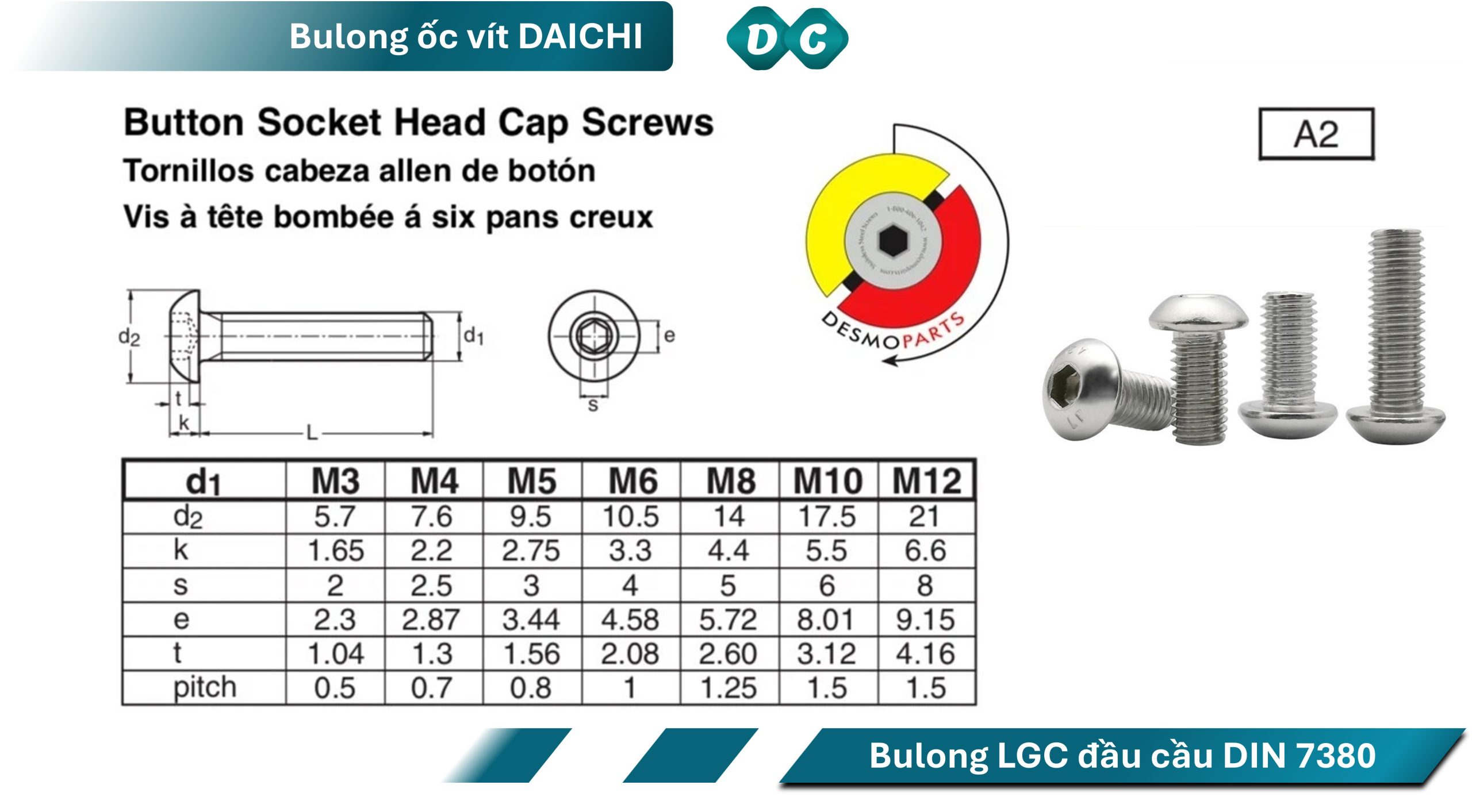 Bảng thông số kỹ thuật bulong DIN 7380 inox 201